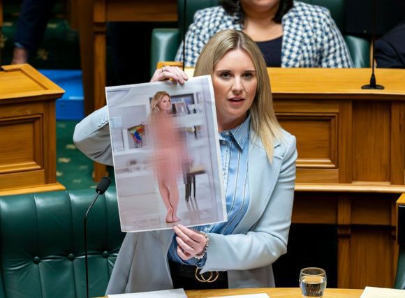 질랜드 액트당 소속 의원 로라 맥클루어가 자기 얼굴과 여성의 나체 사진을 합성한 딥페이크 이미지를 들고 있다. 액트당 엑스(X·옛 트위터) 캡처