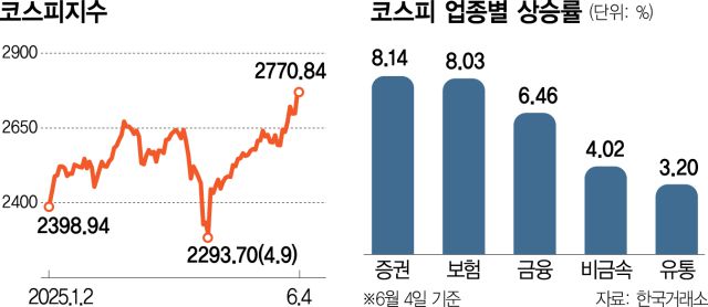 김지원 KB증권 연구원은 “대부분의 업종과 코스피의 83%에 달하는 종목이 상승한 가운데 정책 이행 기대감이 반영됐다”며 “대선 기간 중 증시 부양을 강조한 만큼 증권주가 급등했고 밸류에이션 정상화가 기대되는 지주사, 금융지주들도 랠리를 지속했다”고 설명했다.