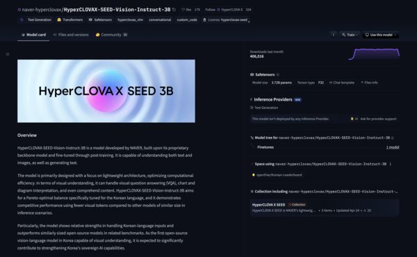 5일 오픈소스 커뮤니티 '허깅페이스'에 따르면 네이버의 오픈소스 AI 모델 '하이퍼클로바X 시드-비전-인스트럭트-3B'는 40만6000회 이상의 다운로드를 기록했다. 지난 4월 말 공개 이후 한 달여 만에 글로벌 업계에서 주목받는 AI 모델로 부상한 것.