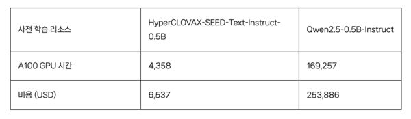 실제 '하이퍼클로바 X 시드-텍스트-인스트럭스-0.5B' 모델의 경우, 유사한 규모의 '큐웬2.5-0.5B-인스트럭스' 모델에 비해 GPU 사용 시간과 비용을 대폭 절감한 것으로 나타났다.