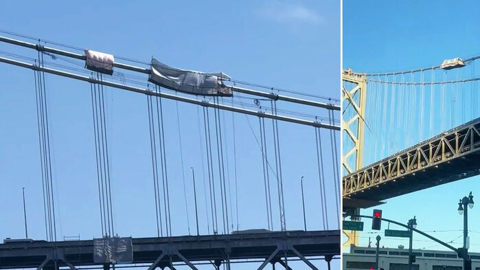 다리 케이블 위 텐트 '깜짝'…"철거 피하려고"