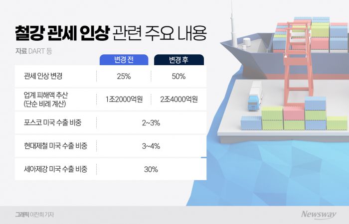 앞서 업계 안팎에서는 25%의 관세 부과로 국내 철강업계가 받을 피해액을 1조2000억원으로 추산했다. 또 한국의 연간 대미 수출액은 510억달러 이상 감소할 거란 분석도 나온 바 있다. 이번 관세 인상분이 현실화되면 단순 비례 계산 시, 철강업계에서 약 2조4000억원의 피해액이 발생할 수 있다.