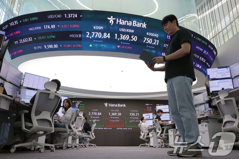 이재명 대통령 취임 첫날인 4일 오후 서울 중구 하나은행 본점 딜링룸 전광판에 증시가 표시되고 있다. 이날 코스피 지수는 전 거래일 대비 71.87p(2.66%) 오른 2,770.84, 코스닥 지수는 9.92p(1.34%) 오른 750.21으로 마감했다. ⓒ News1 박정호 기자 |