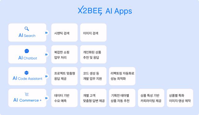X2BEE AI Apps는 ▲고객 맞춤형 검색 경험을 제공하는 AI Search ▲개인화된 상담을 지원하는 AI Chatbot ▲개발 생산성을 높이는 대화형 코딩 도구 AI Code Assistant ▲커머스 운영을 지원하는 AI Commerce+ 등으로 구성돼 있다. 이들은 커머스 운영 전반에 적용되어, 운영 효율과 고객 경험을 모두 개선하고 있다.