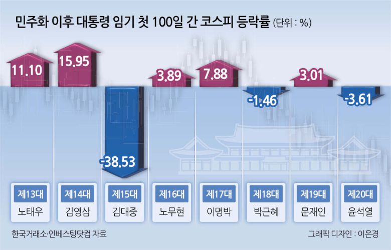 총 8명의 전임 대통령 중 5명(62.5%)은 임기 첫 100일간 코스피 지수가 ‘플러스(+)’ 수익률을 기록했다. 제14대 김영삼 전 대통령의 해당 시기 코스피 상승률이 15.95%로 가장 높았다. 그 뒤를 제13대 노태우 전 대통령(11.10%), 제17대 이명박 전 대통령(7.88%), 제16대 노무현 전 대통령(3.89%), 제19대 문재인 전 대통령(3.01%) 순서로 뒤따랐다. 전임 대통령 3인(제15대 김대중, 제18대 박근혜, 제20대 윤석열)은 약세를 보였다.