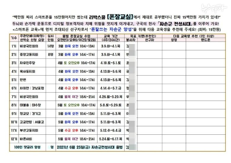 또 문건에는 폰잘교육 대상들을 12개 기수로 나눠 진행한다는 내용이 담겨 있었는데, 기수별 주관 단체는 모두 보수단체들이었다. 자유대한민국 비상국민회의, 육군사관학교 등 학교의 보수 성향 동지회, 보수 성향 민간 싱크탱크 차세대미래전략연구원, '문재인은 공산주의자'라고 주장했던 고영주 변호사가 창당한 자유민주당, 대한민국지키기 불교도총연합회, 대한민국수호예비역장성단, 사회정의를 바라는 전국교수모임 등이다.