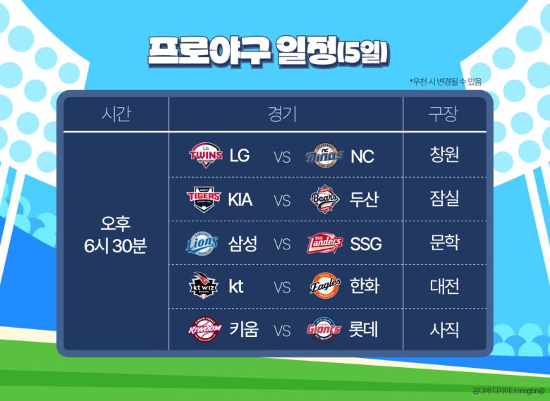 한편 삼성은 SSG 랜더스를 상대로 이승현을 올린다. SSG는 1선발 미치 화이트를 앞세운다. 롯데 자이언츠와 키움 히어로즈는 각각 터커 데이비슨과 하영민을 선발로 예고했다.