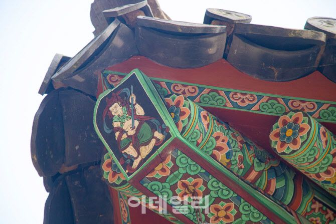 안성 청룡사 대웅전 추녀 귀퉁이에 그려진 금강역사.(사진=경기관광공사)