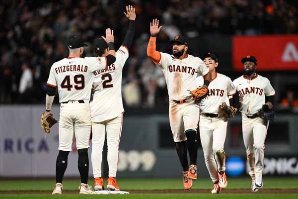 경기를 승리로 마무리한 샌프란시스코 선수들이 하이파이브를 나누고 있다. 사진= Eakin Howard-Imagn Images= 연합뉴스 제공