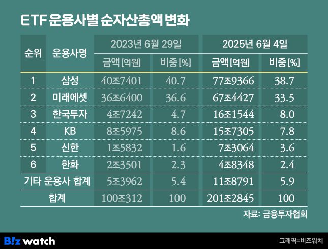 시장 성장과 함께 자산운용사 간 경쟁도 더욱 치열해지고 있다. 삼성자산운용과 미래에셋자산운용의 ETF 순자산총액은 각각 77조9366억원(이하 점유율 38.7%), 67조4427억원(33.5%)으로 '양강' 지위를 유지하고 있다. 두 운용사의 점유율이 전체 시장의 70%를 웃돈다.