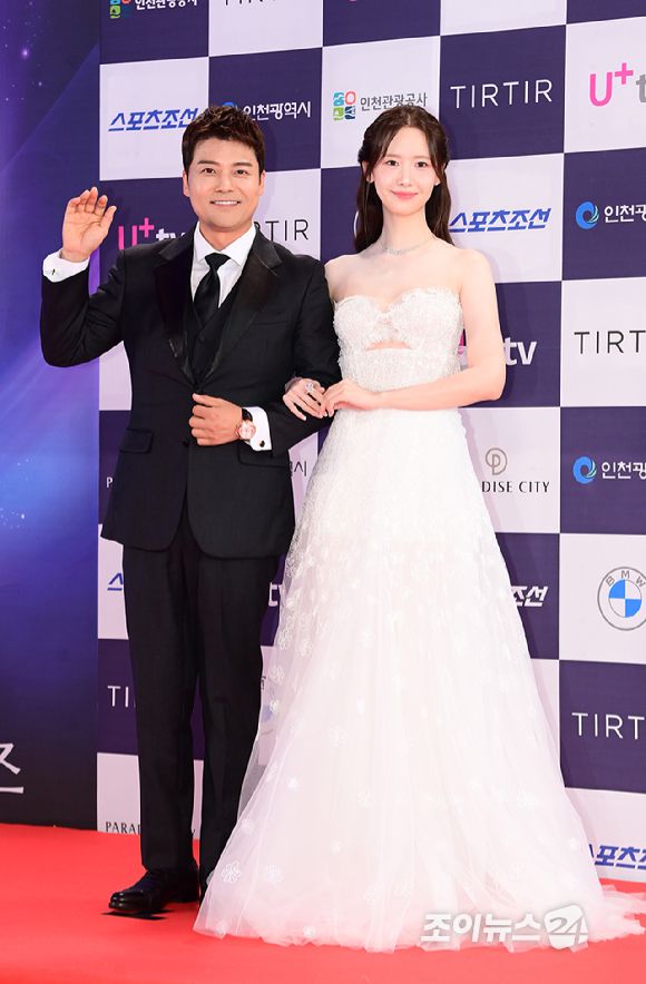 방송인 전현무와 배우 임윤아가 19일 오후 인천 중구 파라다이스시티에서 열린 '제3회 청룡시리즈어워즈' 레드카펫 행사에 시상식 MC로 참석하고 있다. [사진=정소희 기자]