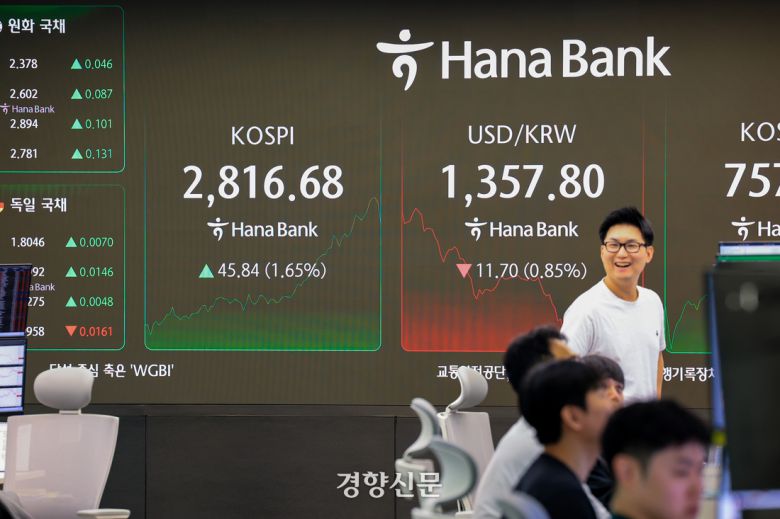 5일 서울 중구 하나은행 딜링룸 현황판에 2800선을 돌파한 코스피 지수가 표시돼 있다. 한국거래소에 따르면 이날 오전 9시 55분쯤 코스피는 2800선을 돌파했다. 코스피가 장중 2800을 넘은 것은 작년 7월 19일 이후 10개월여 만이다. 2025.6.5 이준헌 기자 |