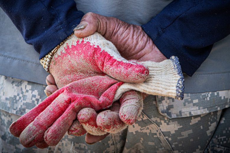 한 농민이 주름진 손으로 장갑을 쥔 채 모내기를 지켜보는 모습. 연합뉴스 |