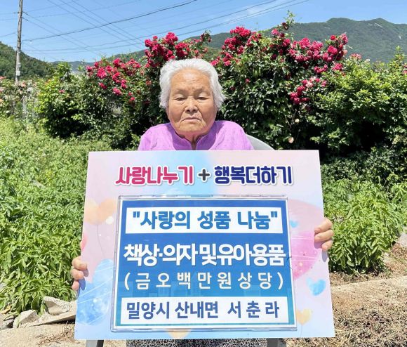 경남 밀양시는 산내면에 사는 서춘라(87)씨가 아동양육시설에 전달해달라며 500만원 상당의 책상, 의자, 분유, 기저귀 등 유아용품을 기탁했다고 5일 밝혔다.