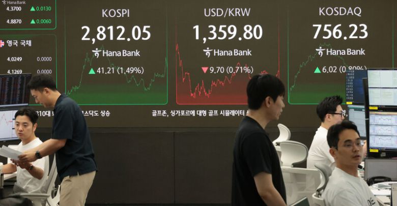 5일 서울 중구 하나은행 딜링룸 현황판에 코스피 지수 등이 표시되고 있다. 이날 코스피 지수는 전 거래일 대비 41.21(1.49%) 오른 2812.05에, 코스닥은 6.02포인트(0.80%) 오른 756.23에 장을 마감했다. 연합뉴스 |