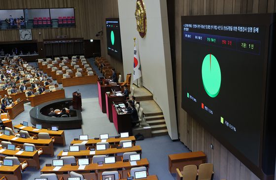 5일 국회에서 열린 본회의에서 '김건희와 명태균ㆍ건진법사 관련 국정농단 및 불법 선거 개입사건 등 진상규명을 위한 특별검사 임명 등에 관한 법률안'이 통과되고 있다. 연합뉴스