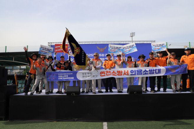 5일 포천종합운동장 보조경기장에서 열린 '제6회 경기도 북부 의용소방대 소방기술경연대회'에서 종합우승을 차지한 연천소방서 대원들이 우승기를 흔드는 세레머니를 하고 있다./경기도북부소방재난본부
