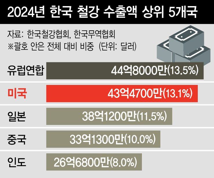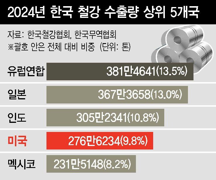 지난해 대미 철강 수출량은 전체 철강 수출의 10%도 채 안 되지만, 트럼프 미국 행정부의 관세 부과에 국내 철강 업계가 체감하는 부담은 훨씬 크다. 미국이 수입 철강 관세를 25%에서 50%로 높이면서, 놓쳐선 안되는 철강 핵심 시장인 미국을 공략하기가 더 어려워졌을뿐 아니라 미국 외 다른 나라의 철강 수출길까지 좁아지고 있기 때문이다.