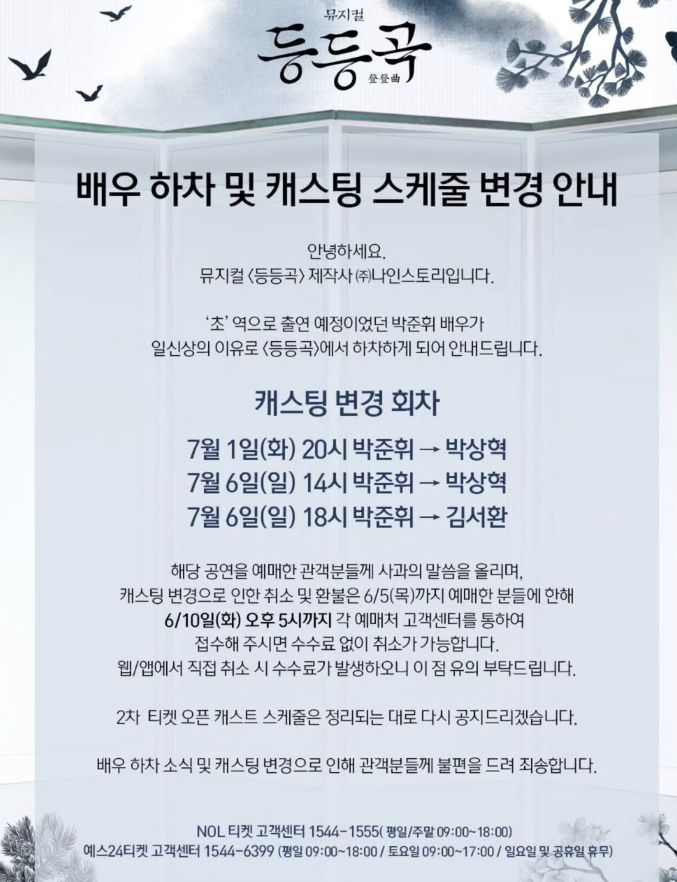 5일 '동등곡' 제작사 나인스토리는 "초 역으로 출연 예정이었던 박준휘가 일신상 이유로 하차하게 됐다"고 공지했다. 이어 "예매한 관객분들께 사과의 말씀을 올리며, 캐스팅 변경으로 인한 취소 및 환불은 5일까지 예매한 분들에 한해 10일 오후 5시까지 각 예매처 고객센터를 통하여 접수해 주시면 수수료 없이 취소 가능하다"고 전했다.