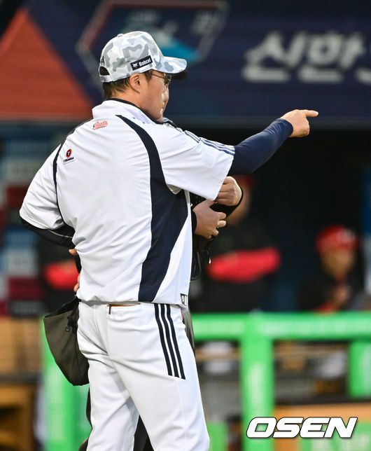 4회말 1사 2,3루 대타 김인태의 체크스윙 삼진때 조성환 감독대행이 그라운드로 나서 김익수 구심에게 항의하고 있다. 2025.06.05 / soul1014@osen.co.kr