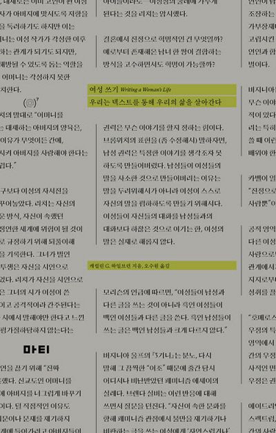 컬럼비아대학 영문학과의 최초 여성 종신교수이자 여성운동의 지도자였던 캐럴린 하일브런은 여성의 이 같은 ‘기록되지 못하는 삶’에 주목했다. 그는 여성의 삶을 해석하는 작업은 다 새로 만들거나 다시 말해야만 한다고 했다.