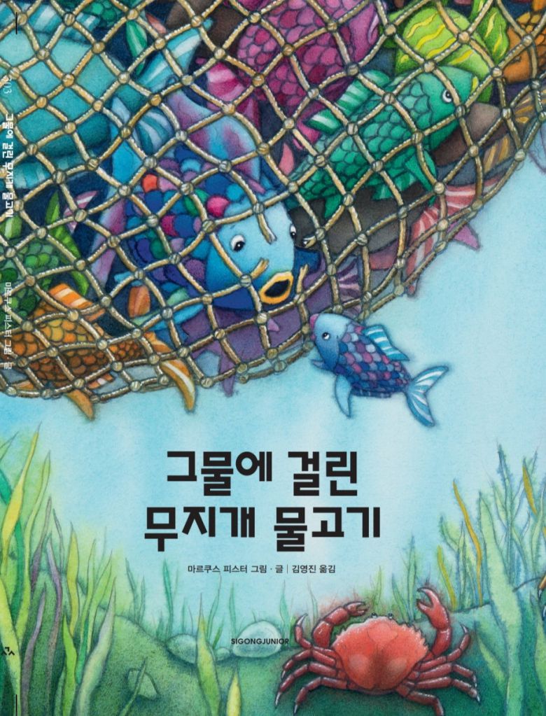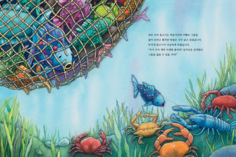 알록달록한 색채로 행복한 물고기들의 일상을 그린 삽화는 순식간에 분위기가 반전된다. 책 한쪽 모서리에 그려진 그물에 겹겹이 쌓인 물고기들을 보면 절로 숨이 턱 막힌다. 그때, 몸집이 작은 꼬마 물고기가 탈출한다. 무지개 물고기는 “어서 가서 게와 가재를 불러와!”라고 외친다. 바닷속 작은 생명체들이 어떻게 이 위기를 헤쳐 나갈지 응원하며 마지막 장까지 넘겨보자.