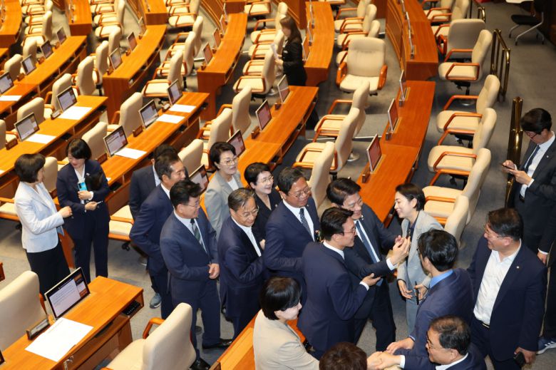 ‘줄을 서시오’ 총리 지명자와 기념촬영 김민석 국무총리 지명자가 5일 국회 본회의에서 의원들과 기념촬영을 하고 있다. 연합뉴스 |