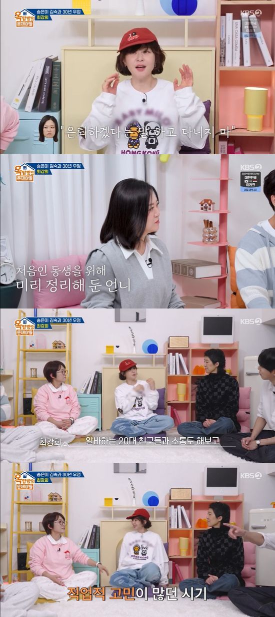 최강희는 "제가 일을 쉬고 있을 때 고깃집에서 알바를 했다. 그러다 숙이 언니가 언니네 집 가사도우미를 시켜줬다. 당시 언니가 '은퇴를 하던 말던 너만 알고 있어. 어디에 말하고 다니지 마'라고 했다"고 말했다.