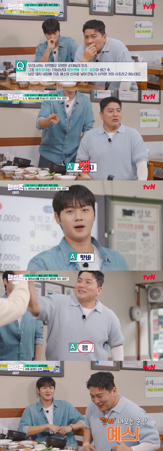 오상욱은 오답인 핫바를 외쳤고, 김태균은 햄이라고 말해 정답을 맞혔다. 김태균은 "소시지 아웃되고 큰일 났다 했는데 핫바가 나오는 순간 '예스' 했다. 이 프로그램 유익하다. 이런 정보들을 얻고 가네"라며 너스레를 떨었다.
