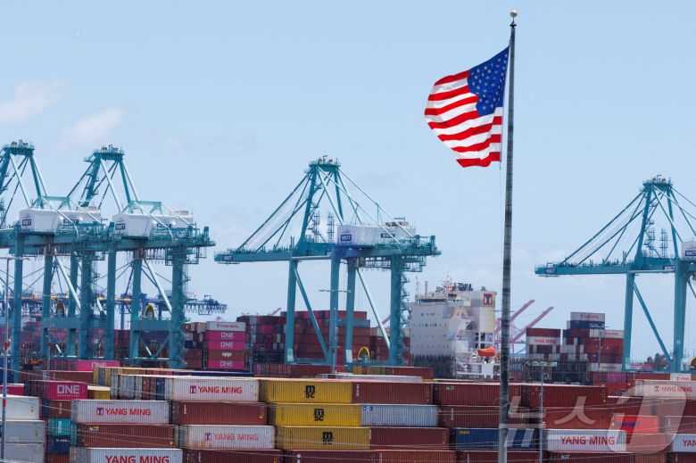 미국 캘리포니아주 로스앤젤레스항에 선적된 컨테이너 위로 미국 성조기가 나부끼고 있다. 2025.05.13. ⓒ 로이터=뉴스1 ⓒ News1 권영미 기자 |
