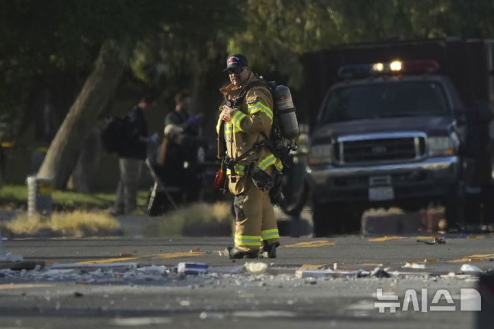 [팜스프링스=AP/뉴시스] 사진은 17일(현지 시간) 미국 캘리포니아 팜스프링스 폭발 현장에서 한 소방관이 서 있는 모습. 2025.05.18. |
