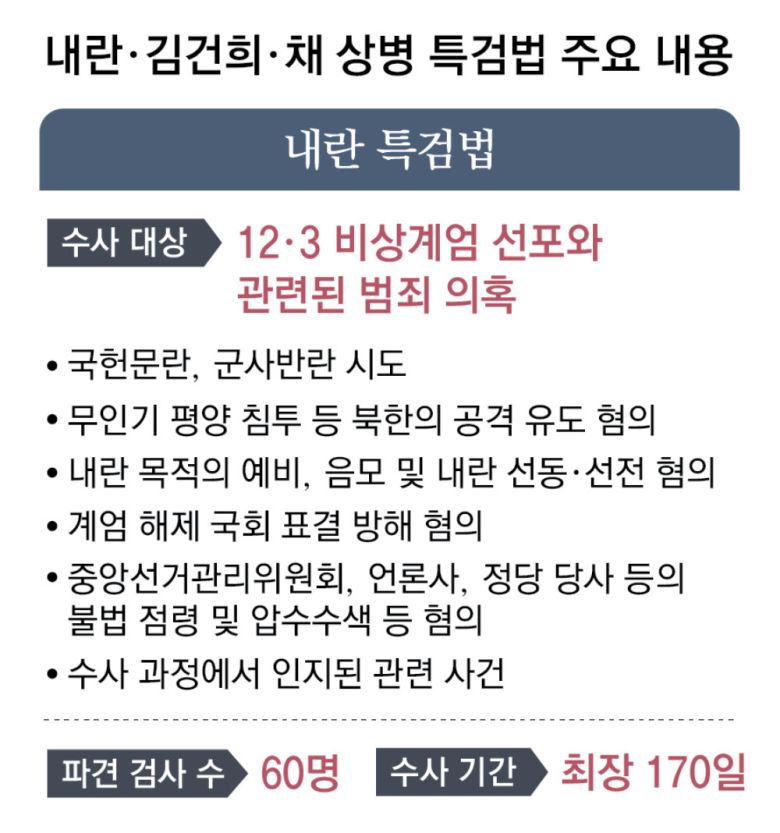 더불어민주당 원내지도부 관계자는 5일 이재명 정부 출범 후 첫 국회 본회의에서 3대 특검법을 통과시킨 배경에 대해 이렇게 말했다. 내란 특검은 비상계엄 선포와 관련한 내란, 외환 유치 행위 등 11개 범죄 혐의가, 김건희 특검은 도이치모터스 주가 조작, 명태균 씨의 공천 개입 의혹 등 16개 혐의가 수사 대상이다. 집권 초 비상계엄과 윤석열 전 대통령 부부를 둘러싼 각종 의혹에 대한 전방위적인 수사가 동시다발적으로 진행되는 것이다.
