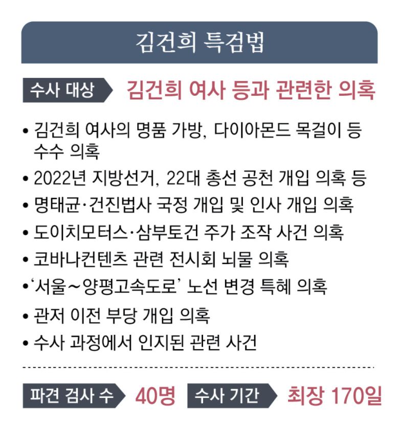 김건희 특검법은 4월 민주당이 기존의 김건희 특검법과 명태균 특검법을 통합한 것으로 수사 대상에 김건희 여사의 주가 조작, 명품백 수수 의혹 등 개인 비리뿐 아니라 명태균 씨와 ‘건진법사’ 전성배 씨 관련 의혹 등도 대거 포함됐다.
