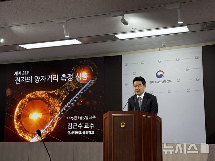 [서울=뉴시스] 심지혜 기자=김근수 연세대 교수는 5일 정부 세종청사에서 진행한 브리핑에서 양범정 서울대 교수 연구팀과 세계 최초로 고체 물질 속 전자의 양자거리 측정에 성공했다고 밝혔다. |