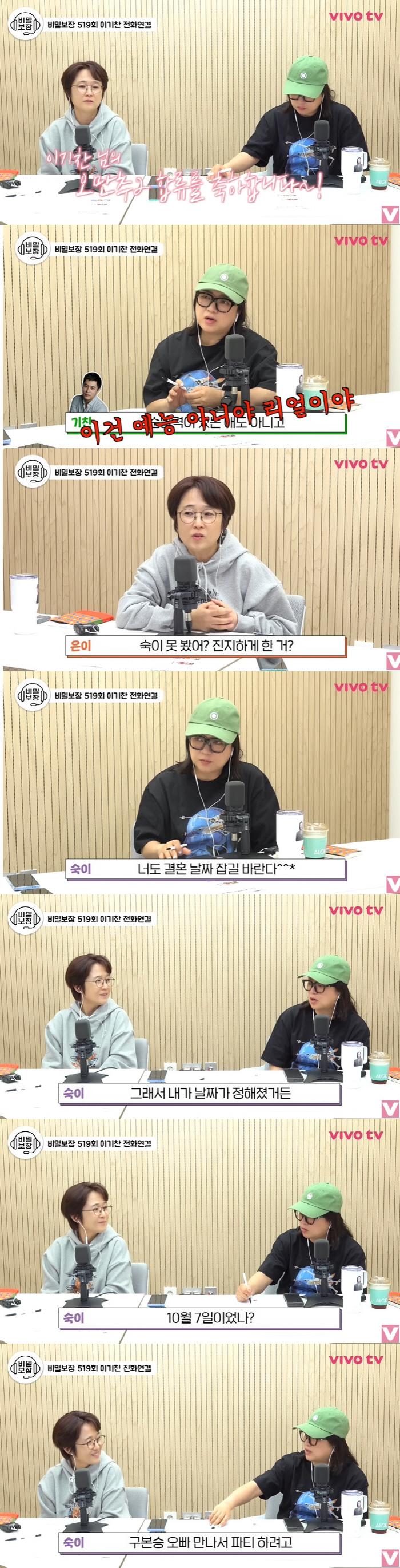 그러면서 김숙은 "너도 결혼 날짜 잡길 바란다. 결혼 날짜가 정해졌다. 10월 7일이었나"라면서 "그날 윤정수 오빠랑 구본승 오빠랑 만나서 파티 할거다. '숙이의 남자들' 리스트에 있는 분들이다"며 장난을 쳐 웃음을 안겼다.