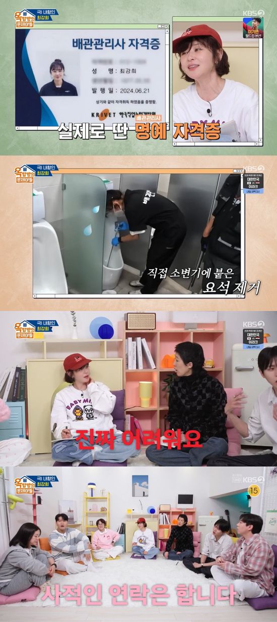 한편 최강희는 아르바이트로 배관 관리를 하다가 배관 관리사 자격증을 취득했다고 밝혀 모두를 놀라게 했다. 그는 "하수구 배관을 관리하는 거다. 엑스레이로 막힌 부분을 본다. 남자 화장실 소변기 밑을 까서 요석을 깨는 일 등을 한다"며 "가장 극한 직업이었다. 제가 비위가 센데 위에서 요석이 떨어지고 잘못해서 물이 떨어지면 쉽지 않다"고 고백했다.