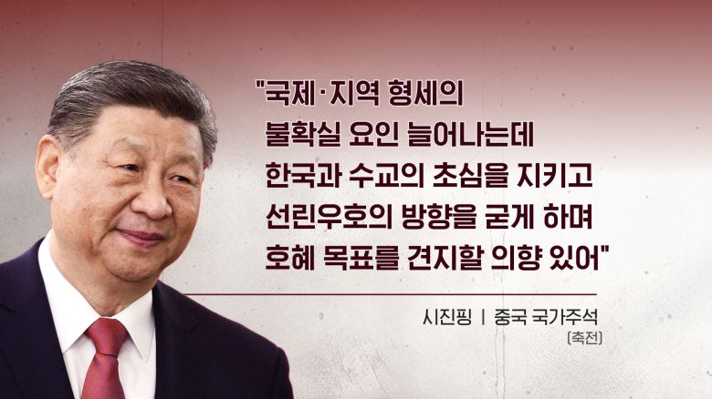 우선 시진핑 중국 국가주석이요. 한국 정부에 전달한 축전에서 한국과 중국이 중요한 이웃이자 협력 동반자라고 강조를 했습니다. 또 한중 관계의 발전을 매우 중시하고 있다면서 국제 정세의 불확실성이 커지는 가운데 양국이 수교의 초심과 상호 이익이라는 목표를 지켜가자고 밝혔습니다.