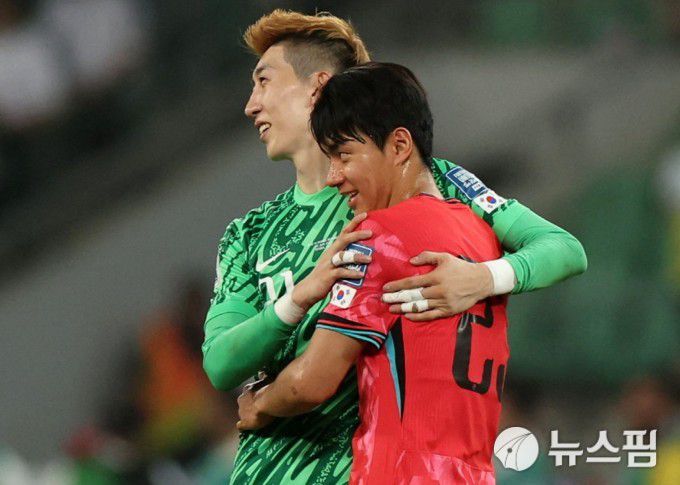 [바스라 로이터 =뉴스핌] 박상욱 기자 = 조현우(왼쪽)와 전진우가 6일 북중미 월드컵 아시아 3차 예선 B조 9차전 원정 경기에서 승리한 뒤 포옹하며 기쁨을 나누고 있다. 2025.6.6 psoq1337@newspim.com
