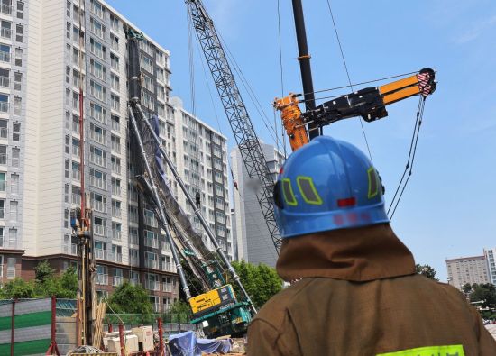 6일 경기 용인시 기흥구 서천동 인덕원~동탄 복선전철 공사 현장에서 중장비인 천공기(지반을 뚫는 건설기계)가 넘어져 인근 아파트 건물 벽면에 기댄 모습으로 쓰러져 있다. 연합뉴스