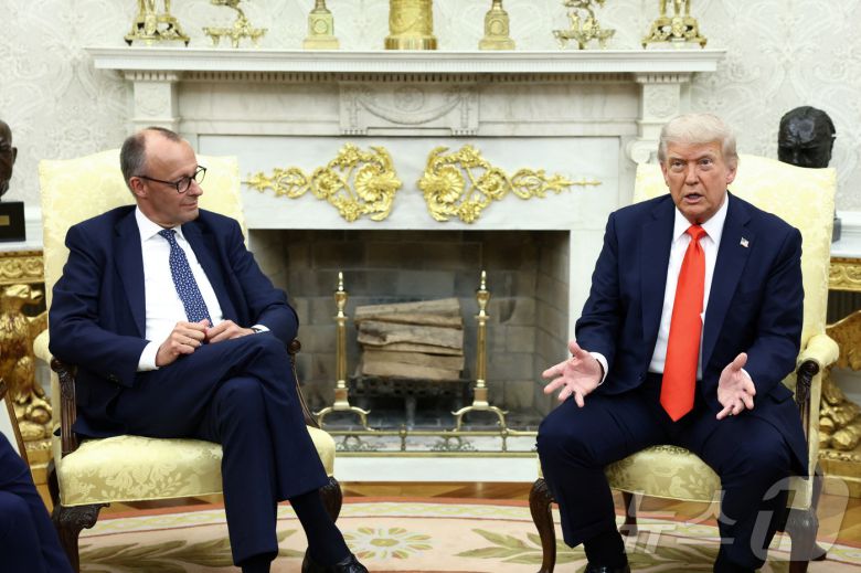 도널드 트럼프 미국 대통령과 프리드리히 메르츠 독일 총리가 5일(현지시간) 워싱턴 백악관에서 회담을 하고 있다. 2025.06.05 ⓒ 로이터=뉴스1 ⓒ News1 최종일 선임기자