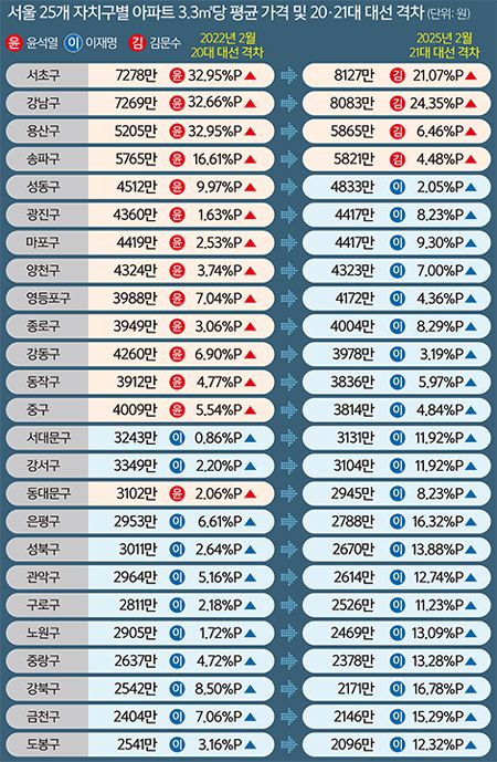 서울 민심의 변화는 ‘강북’의 변화에서 도드라진다. 이 대통령은 성동을 포함해 광진 48.09%, 마포 48.41%등 문재인 정부에서 아파트가격 상승을 주도했던 한강벨트 강북 권역 중 용산을 제외하고 승리했다. 3년 전에서는 윤 전 대통령이 승리한 지역이었다.
