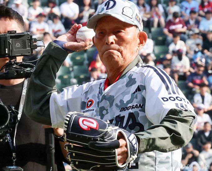 (서울=뉴스1) 박세연 기자 = 현충일인 6일 서울 송파구 잠실야구장에서 열린 프로야구 신한솔뱅크 KBO리그 두산과 롯데의 경기에 6·25 참전 조종사인 김두만 장군(예비역 공군 대장)이 시구하고 있다. 김두만 장군은 1927년생으로 공군작전사령관, 제11대 공군참모총장 등을 역임했다. 6·25 전쟁 당시 그는 대한민국 최초로 100회 출격 기록을 세워 ‘하늘의 영웅’으로 불렸다. 김 장군은 을지무공훈장, 은성충무무공훈장 등을 받았고 '6·25 전쟁 10대 영웅'으로도 선정됐다. 2025.6.6/뉴스1  Copyright (C) 뉴스1. All rights reserved. 무단 전재 및 재배포,  AI학습 이용 금지. /사진=(서울=뉴스1) 박세연 기자
