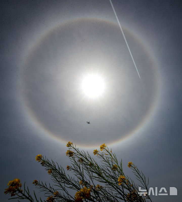 [제주=뉴시스] 우장호 기자 = 추위가 물러난 16일 오후 제주시 이호동에서 바라본 하늘에 햇무리가 관측돼 시선을 사로잡고 있다. 햇무리는 상공에 균일하게 옅은 구름이 드리우면 해 둘레에 빛깔이 있는 둥근 테두리가 생기는 현상을 말한다. 2025.04.16. woo1223@newsis.com