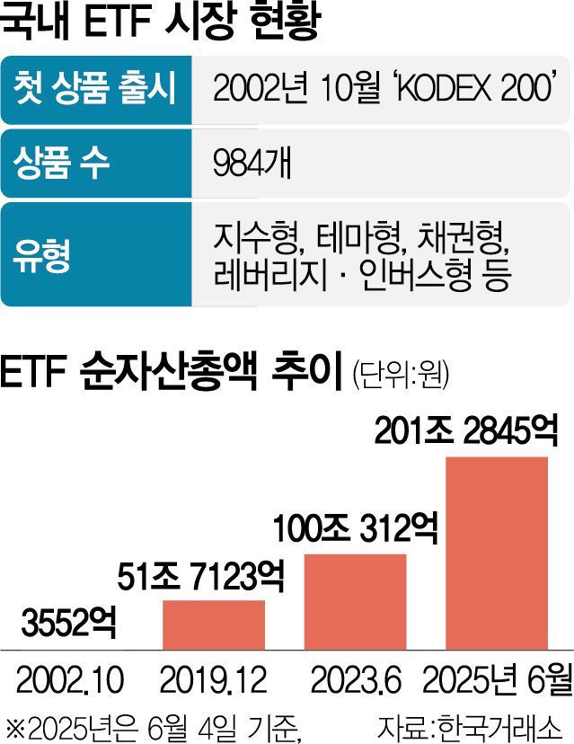 6일 한국거래소에 따르면 전 거래일 기준 국내 ETF 순자산총액(AUM)은 201조 2845억 원으로 집계됐다. 2002년 국내 첫 ETF인 ‘KODEX 200’이 상장된 후 23년 만에 이룬 성과다. 상장 종목 수도 984개에 달하며 ‘1000개 시대’도 앞두고 있다.