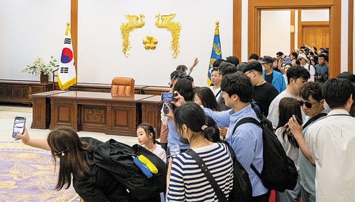 이재명 대통령이 대통령 집무실을 다시 청와대로 옮기겠다고 밝힌 후, ‘마지막 관람’ 기회를 잡으려는 시민들이 청와대로 몰리고 있다. 평일 기준 1만2000~1만3000명 수준이던 관람객 수가 대선 후 하루 정원 2만2000명을 거의 채우고 있다. 홈페이지를 통한 관람객 예약도 한때 접속자가 몰려 서버가 마비됐고, ‘오픈런(개장 전 줄서기)’까지 펼쳐진다. 6월 평일과 주말 예약은 대부분 마감됐다고 한다. /안준현·강지은 기자