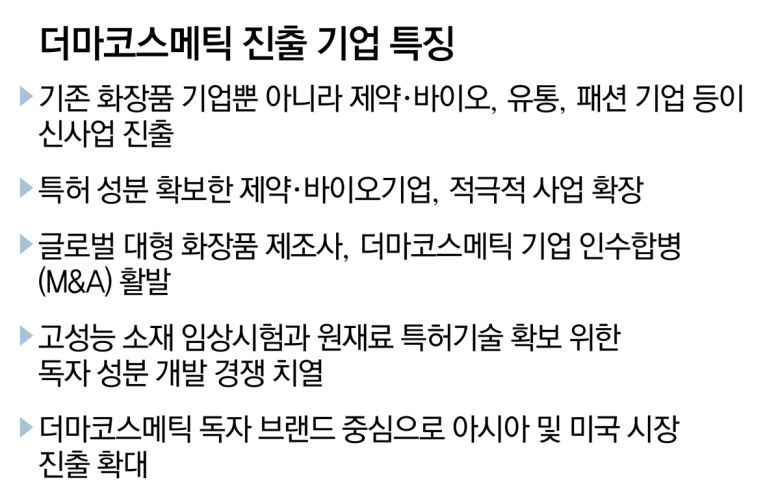 한국의 더마코스메틱 제품들이 인스타그램, 틱톡 등 SNS에서 입소문을 타면서 한국 여행 시 구매 필수템으로 자리 잡았다. 외국인 관광객들의 수요로 시장이 커지자 기존 화장품 제조사뿐 아니라 제약·바이오기업, 백화점 등 유통사, 패션업체들까지 일제히 더마코스메틱 사업에 뛰어들고 있다.