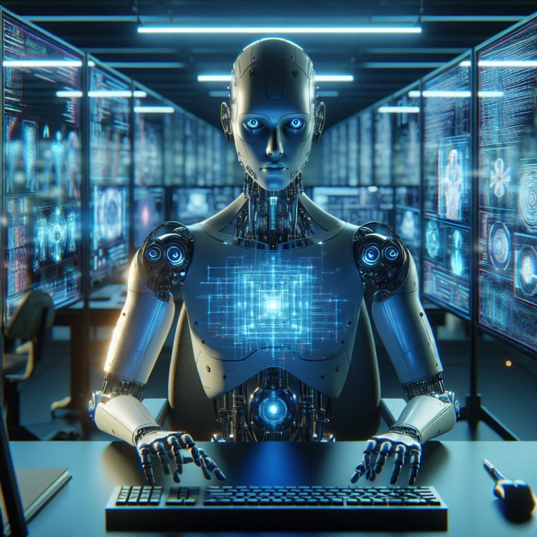 AI가 코드를 설계·구현하는 시대를 상징하듯 첨단 기술이 적용된 로봇이 디지털 데이터 인터페이스가 있는 컴퓨터 앞에 앉아 있는 미래적 환경이 5일 관련 보도와 함께 연출되고 있다.