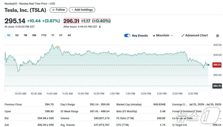 6일(현지시간) 뉴욕증시에서 테슬라는 3.67% 급등한 295.14달러를 기록했다. 이날 반등에도 시총은 9506억달러로 집계돼 여전히 시총 1조달러를 하회했다.