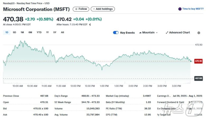 이날 MS가 사상 최고치를 경신함에 따라 시총도 3조4960억달러를 기록, 사상 최고를 경신했다. 이는 시총 2위인 엔비디아보다 400억달러 정도 더 많은 것이다.