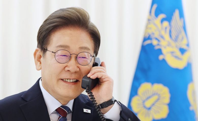 | 이재명 대통령이 6일 서울 한남동 관저에서 도널드 트럼프 미국 대통령과 통화하기 위해 수화기를 들고 있다. / 사진=연합뉴스 |